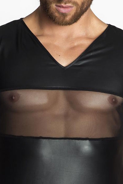 Tee-shirt V pour homme provocant et indécent avec sa large bande de tulle transparent qui laisse voir les pectoraux et les tétons.