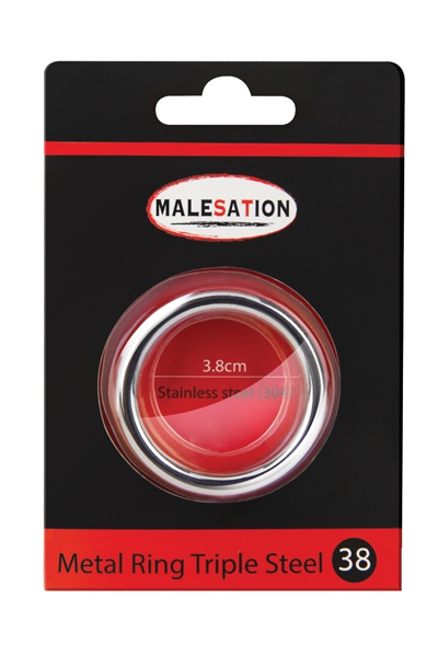 Le cockring Metal ring Triple steel de Malesation est fabriqué en acier Inoxydable (sans nickel). Il est assez lourd, entre 80 et 100 g en fonction du diamètre qui convient à votre verge.