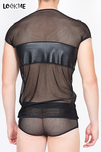 Ce tee-shirt homme est vraiment sexy avec sa matière transparente faite de résille fantaisie douce et fluide, et l'effet opaque et viril de la large bande faux cuir qui barre le torse.