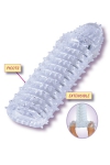 Cette gaine d'extension pour pénis s'utilise soit directement sur le pénis, soit sur un vibromasseur. Ses picots proéminents et sa forme annelée accroissent les sensations et le plaisir féminin au cours de la pénétration, tandis que l'homme bénéficie d'un sexe plus épais, plus long et moins sensible, retardant aisni son éjaculation.