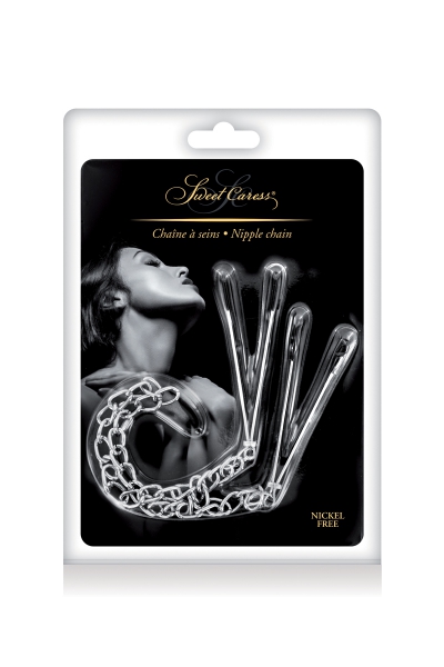 Deux pinces à seins réglables, fixées à une chainette en acier argenté, pour stimuler les tétons de votre partenaire, par Sweet Caress.