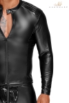 Entrez dans la peau de ce biker sexy chic qui met en avant ses pectoraux et ses épaules, particulièrement bien sculptés par le noir mat du wetlook. Des pièces en vinyle brillant forment des épaulettes qui contrastent avec le wetlook. Le col est fermé par une pression noire.