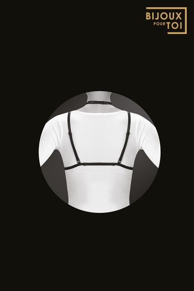 Le harnais de corps Lola est composé de lanières douces et élastiques noires. Il galbe votre poitrine et s'ajuste facilement dans le dos et derrière le cou grâce à des attaches coulissantes.