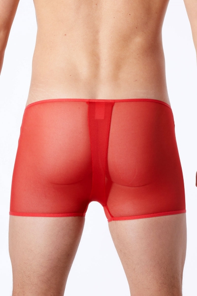 Sensuel et sophistiqué, ce boxer est remarquable par la transparence du tulle sur les cuisses et les fesses, et son empiècement de faux cuir et jersey devant qui simule une forme de string, marquée également derrière par une bande en jersey qui barre juste la raie de fesses.