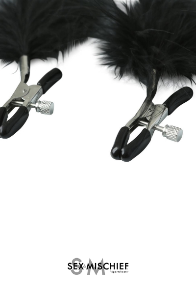 Usez et abusez de cette paire de pinces à tétons ajustables avec des plumes de coq douces et luxueuses qui stimulent la peau lorsqu’elles se balancent, par la marque spécialiste des jeux SM et de bondage Sex and Mischief.