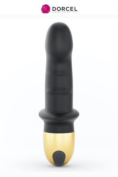 Double stimulation, double plaisir. Aussi à l'aise pour la stimulation anale que vaginale (point G), le vibromasseur Mini Lover de Dorcel débarque en version 2.0 couleur noir et or, rechargeable par USB.