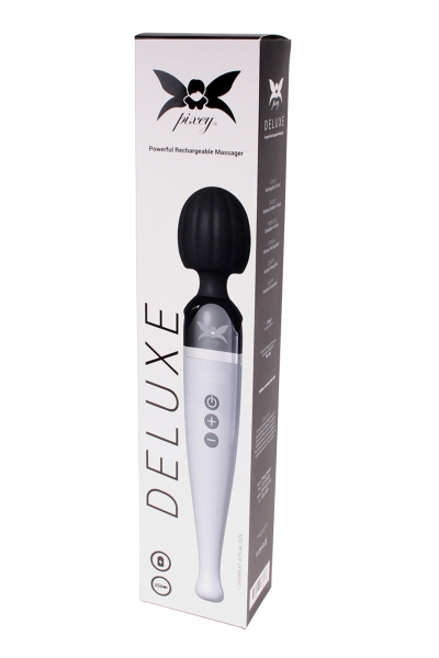 Le vibromasseur Wand Pixey Deluxe est un stimulateur externe hyper puissant (jusqu'à 12 000 vibrations / min), fonctionnant sans fil et rechargeable à l'aide d'un cable USB.