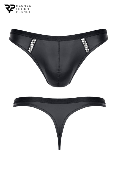 String noir de la marque Regnes Fetish Planet, fabriqué avec du tissu brillant effet wetlook noir. Il dispose d’une large ceinture extensible au niveau de la taille. La coquille permet de bien cacher et de mettre en avant vos attributs virils de mâle. De plus de chaque côté, les petites bandes en résille vous donnent un côté encore plus sexy et envoûtant.