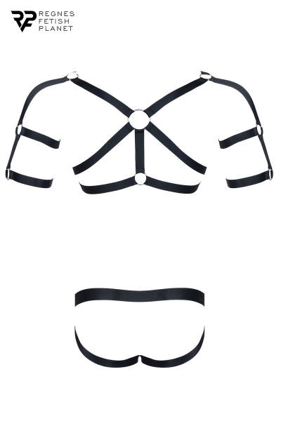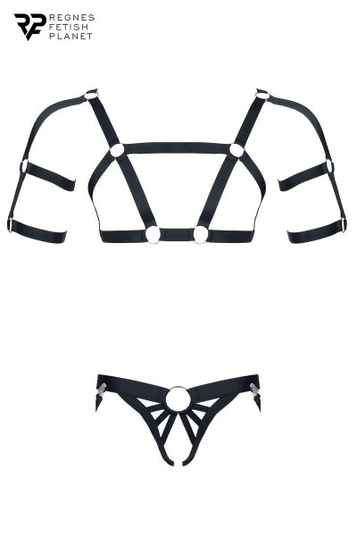 Superbe ensemble BDSM pour homme en tissu élastique noir. Les différentes lanières sont faites pour mettre les pectoraux et biceps en valeur pour la partie haute. En bas, un superbe jockstrap ouvert mettra votre sexe et vos fesses en avant. Les lanières se rejoignent par des anneaux métalliques sans nickel. Pour un meilleur réglage, le jockstrap dispose d'attaches type bretelle.