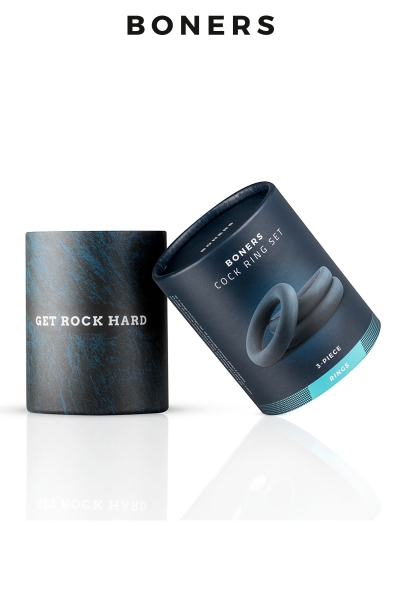 La marque Boners présente le "Cock ring set", un jeu de 3 cockrings classiques de diamètres différents à la fois doux, extensibles et confortables à porter, grâce à leur matière en silicone extra doux.