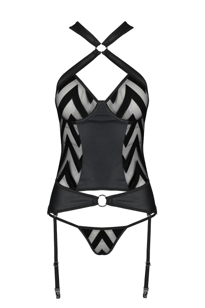 Structurée sur un patron en faux cuir mat fin et souple, la guêpière en tulle décoré de chevrons de velours, met admirablement en valeur la poitrine avec ses bonnets à balconnets et le décolleté en losange qui s'ouvre sur le sillon des seins. Les bandes de faux cuir recentrent la poitrine pour lui donner encore plus de volume, et s'articulent sur deux anneaux chromés qui se terminent par des bretelles ajustables. Elle est fermée dans le dos par une longue bande à agrafes réglable sur deux positions.