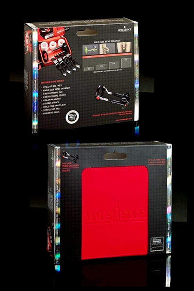 Emballé dans un étui rouge et noir de qualité supérieure et présenté dans une élégante boîte cadeau rouge, MaleEdge Pro est livré avec quatre sangles en caoutchouc, deux patins de rechange, un sac de Voyage et de la gaze cohésive. le tout est accompagné du dvd pédagogique du programme officiel MaleEdge.