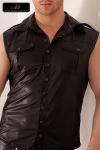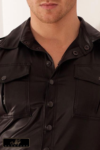Cette veste sans manches fait partie intégrante de la panoplie du séducteur. Sa coupe très structurée exploite à merveille le wetlook mat qui souligne les détails : des poches de poitrine à rabats, des épaulettes, un double pli surpiqué qui descend le long du dos, et le col qui s’ouvre sur une série de boutons pression ton sur ton.