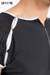 Tout dans ce modèle compose les effets de contrastes : les couleurs du tee-shirt et de ses bordures, les épaules en large résille et le corps de lycra, la couture de l'encolure, la fente fonctionnelle sur le coté de la poitrine fermée par des boutons pression.